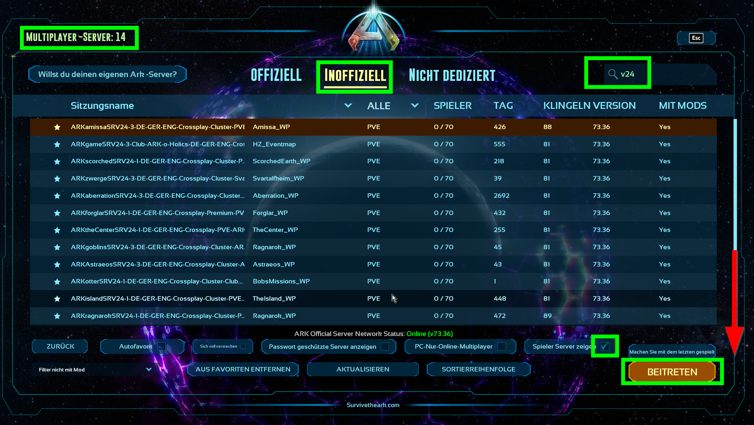 Detaillierte Server-Informationen: Jeder Server präsentiert eine Liste der installierten MODs, damit siehst Du was Dich erwartet.
